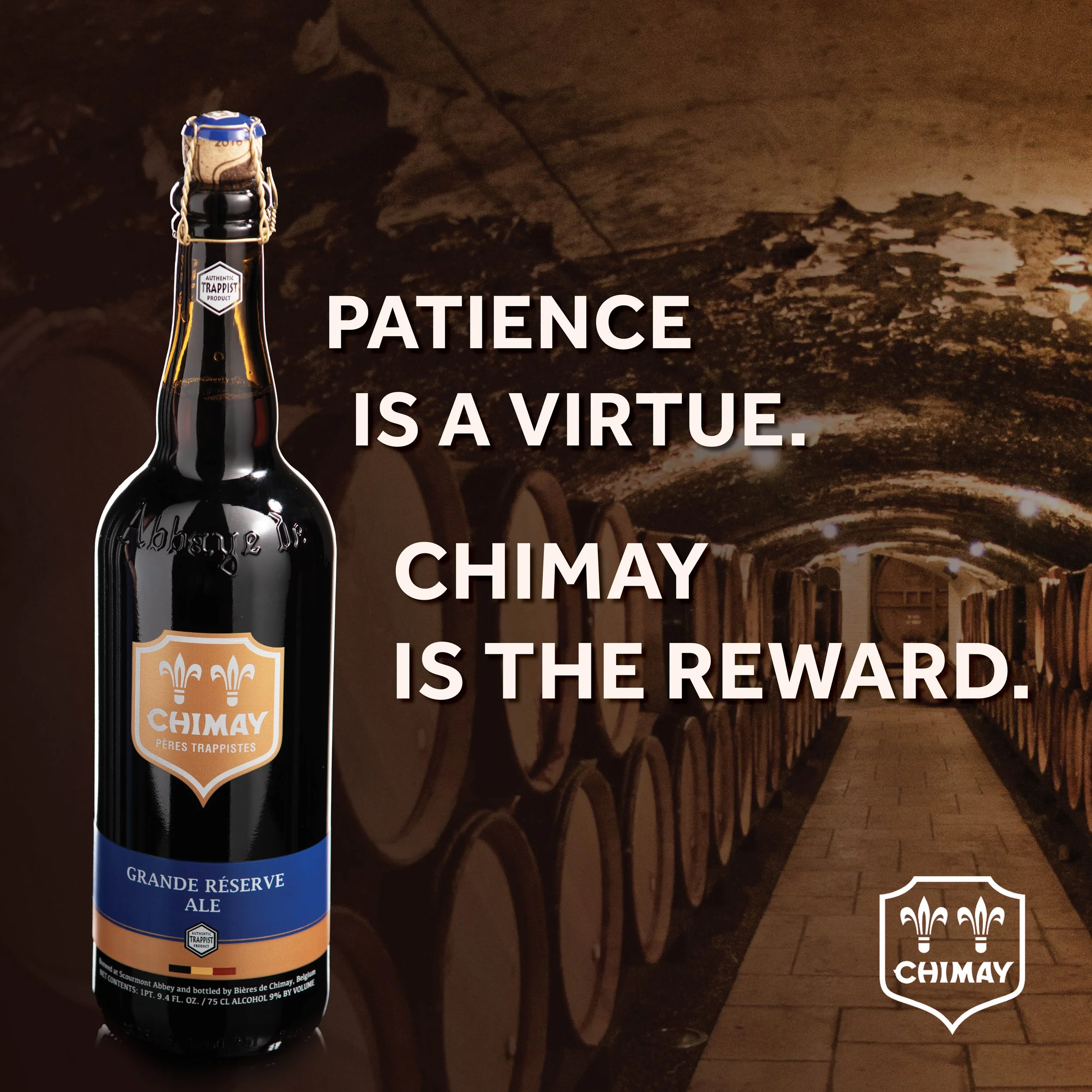 When I pulled the photograph out recently, I built a spec ad around it. I composited the bottle into a stock image of a wine cellar — barrels receding into the dark — and matched the color temperature until the two images looked like one scene. The tagline came quickly: Patience is a virtue. Chimay is the reward.